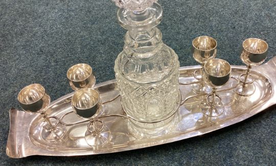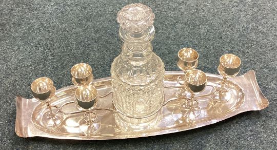 A good silver liqueur set on stand with large cut glass decanter. Birmingham 1913. By Elkington & Co. Approx. 871 grams of gross weight. Est. £800 - £1200.