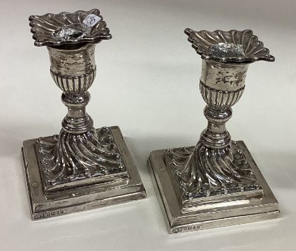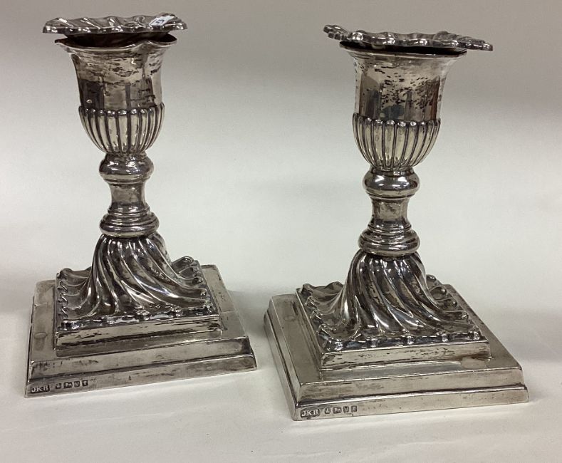 A pair of Victorian silver candlesticks on square bases. Sheffield 1888. By JKR. Approx. 846 grams of gross weight. Est. £150 - £200.