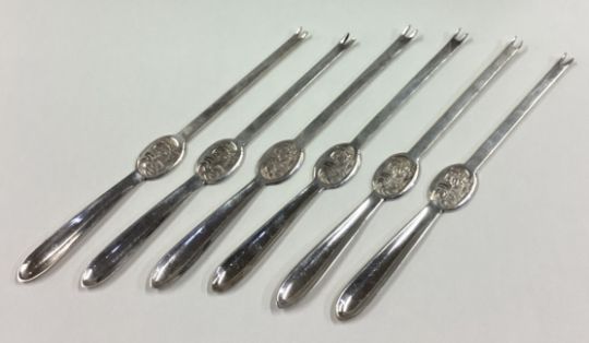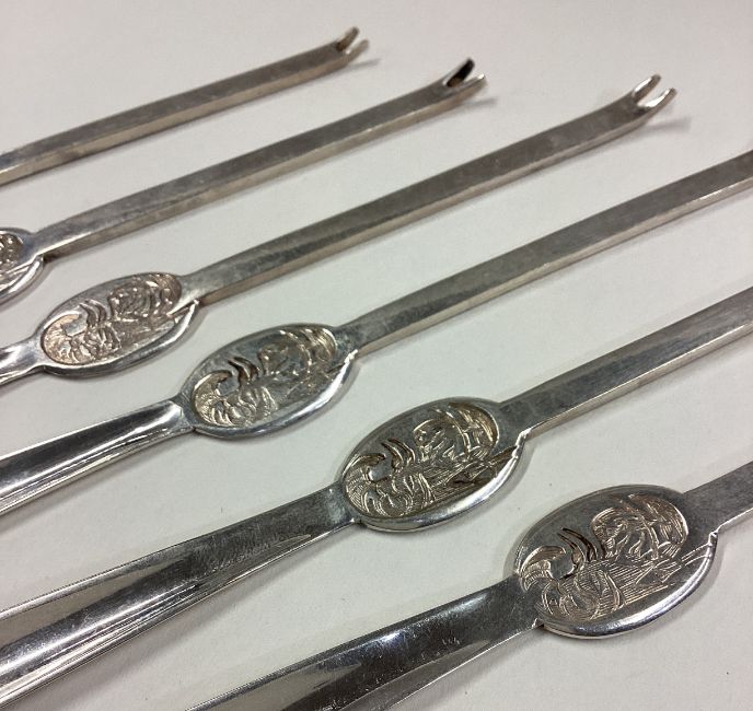 A set of six silver plated lobster picks. Est. £60 - £80.
