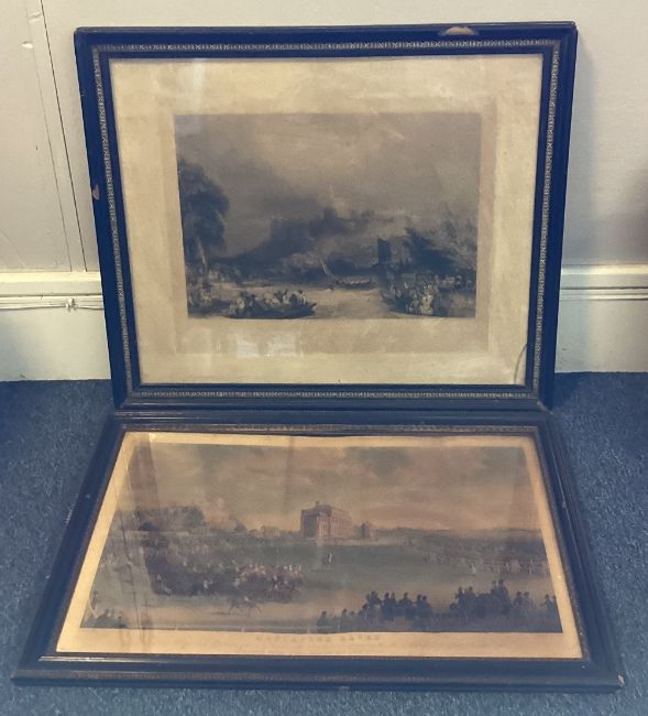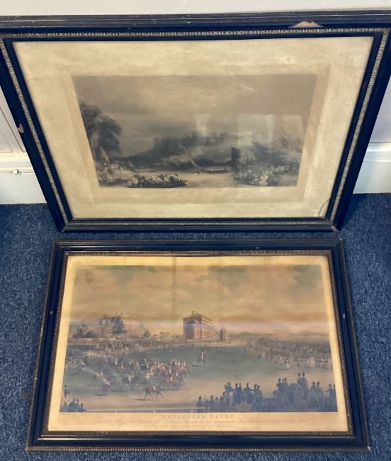 Two old framed and glazed prints depicting Doncaster races and boats on a river entitled 'The Celebration of the Fourth of June at Eton'. Est. £20 - £30.