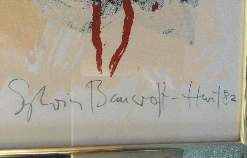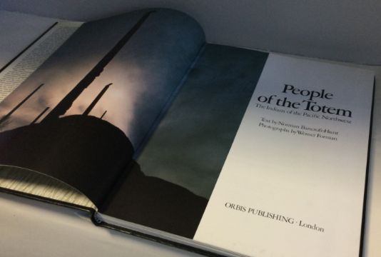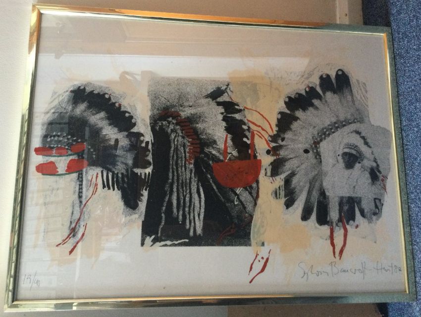 SYLVIA BANCROFT HUNT: (German, 21st Century): A framed and glazed print depicting native American Indians. Limited edition numbered 19/40. Signed to bottom right and dated '82. Together with a book entitled "People of the Totem". Approx. 75 cms x 56 cms. Est. £30 - £40.