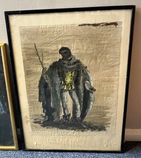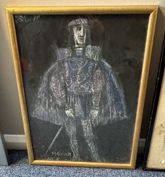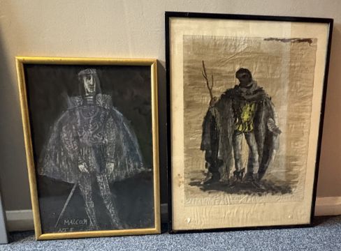 A gilt framed and glazed pastel on black paper entitled 'MALCOLM ACT II' depicting a man in cloak with sword. Labelled 'LUZZATTI 1 costume design for MACBETH, Glyndebourne Festival Opera' and inscribed 'Emanuele Luzzati Exhibited in Costume Design Show Arts Council L. S.' verso. Approx. 33.5 cms x 49 cms (ss). Together with a black framed and glazed similar watercolour. Indistinctly signed to bottom right. Approx. 46 cms x 63 cms (ss). Est. £30 - £50.