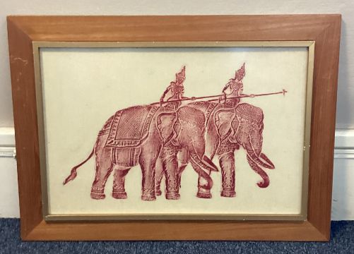 A framed and glazed picture depicting ceremonial elephants. Approx. 51.5 cms x 34 cms (ss). Est. £20 - £30.