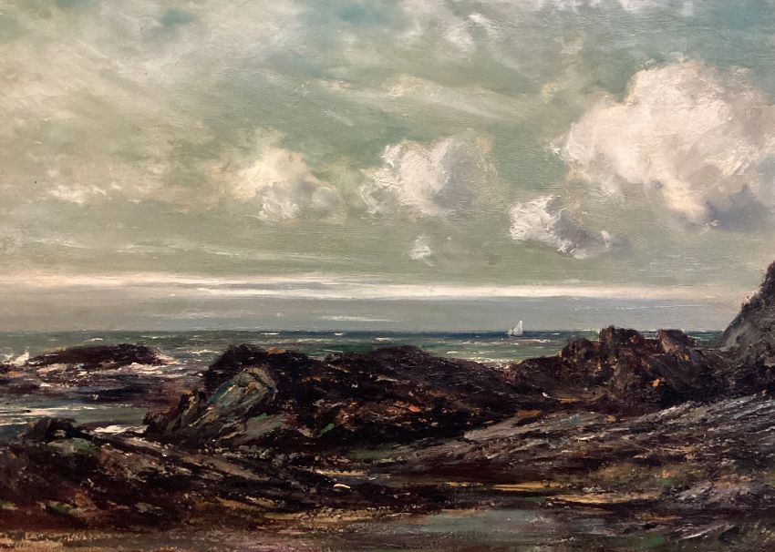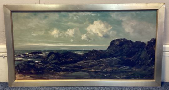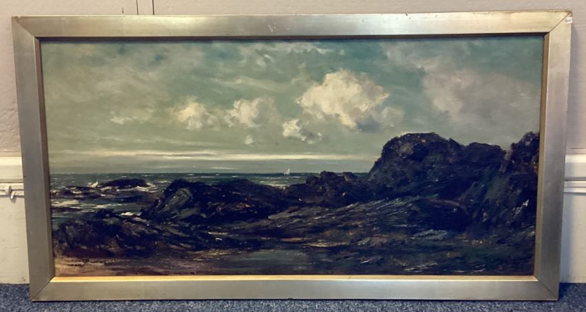 J LAURENCE HART: (British, 1830 - 1907): A gilt framed oil on canvas depicting a rocky coastal landscape with sailing boat at sea. Signed to bottom right. Approx. 75 cms x 36.5 cms. PROVENANCE: NOEL CHANAN. Est. £60 - £80.
