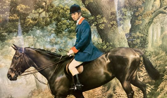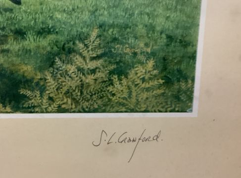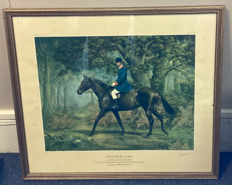 A gilt framed and glazed print depicting HRH The Prince of Wales on horseback. Number 56 / 500. Pencil signed S L Crawford to bottom right. Approx. 57 cms x 45 cms (ss). Est. £20 - £30.