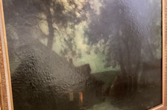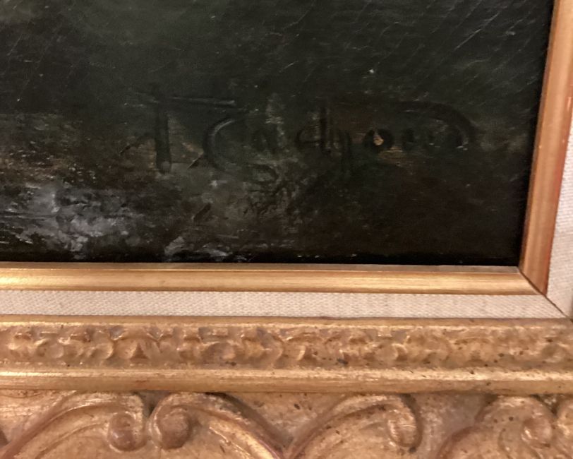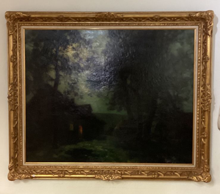 FRANÇOIS CACHOUD: (French, 1866 - 1943): A large gilt framed oil on canvas depicting a nocturnal village scene. Signed to bottom right. Approx. 90 cms x 71 cms (ss). PROVENANCE: NOEL CHANAN. Est. £800 - £1200.