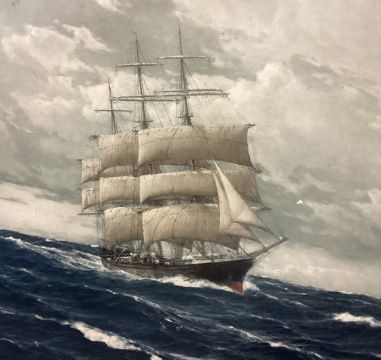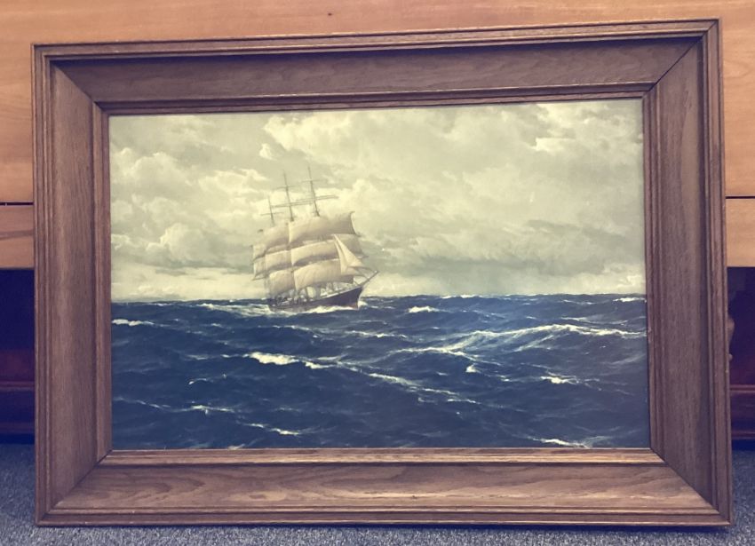 A wooden framed and glazed picture of a galleon at sea. Approx. 68 cms x 43 cms. Est. £20 - £30.