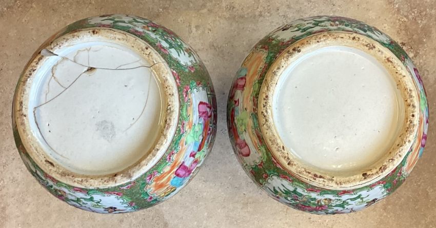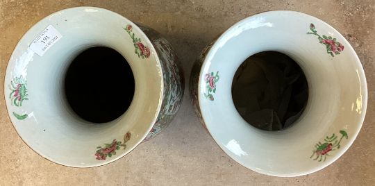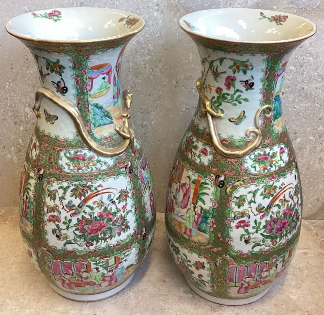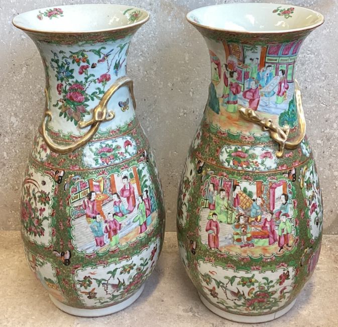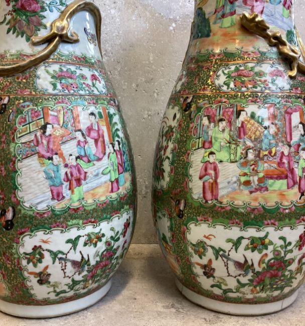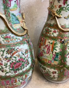 A large pair of decorative Canton vases with gilded decoration. Est. £100 - £150.