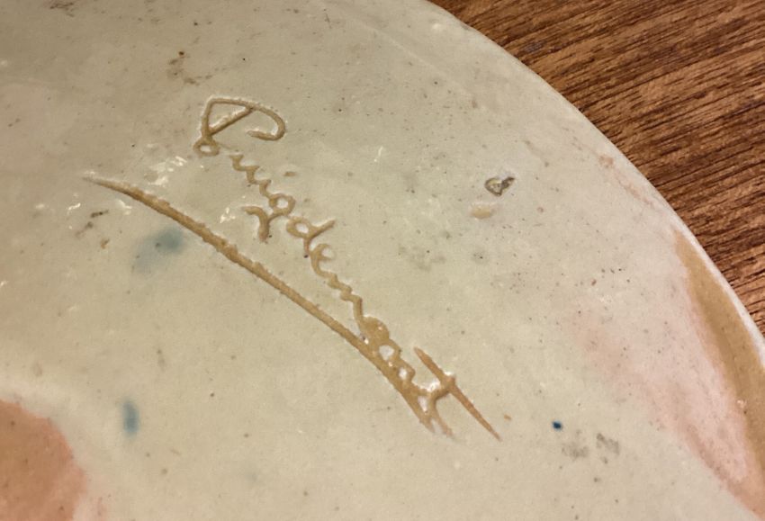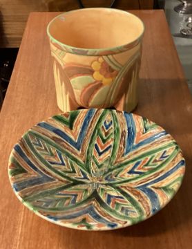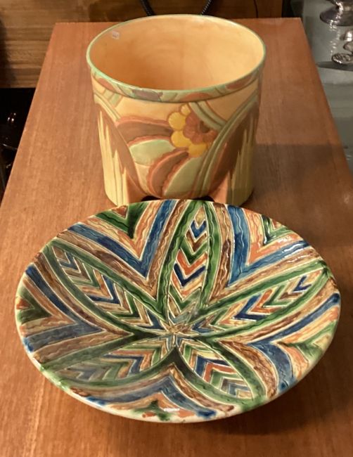A decorative Continental pottery dish in bright colours together with an Arts and Crafts jardinière. PROVENANCE: NOEL CHANAN. Est. £20 - £30.