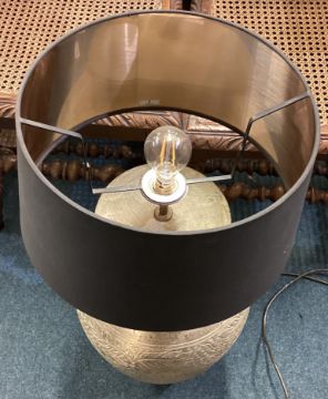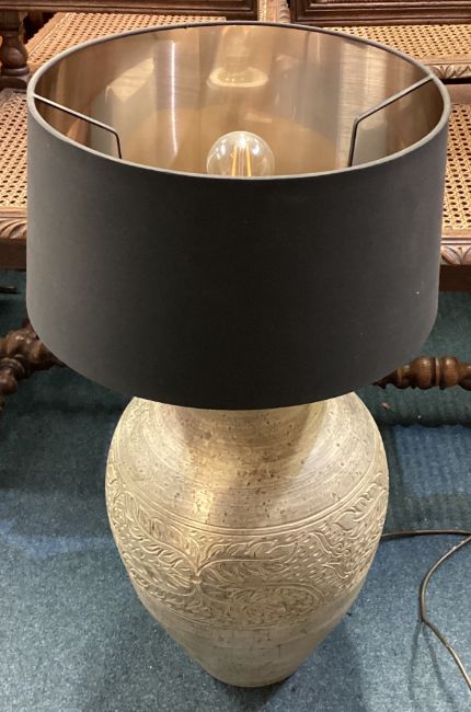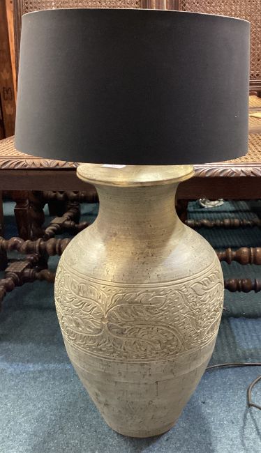 A large 20th Century pottery lamp decorated with flowers together with shade. Est. £20 - £30.
