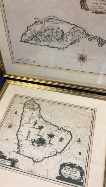 A pair of gilt framed reproduction maps of Barbados and St Christopher Island. Est. £20 - £30.