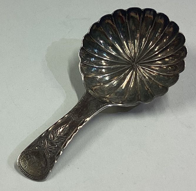 A George III silver caddy spoon with bright-cut decoration to handle. Birmingham 1808. By Joseph Wilmore. Approx. 4 grams. Est. £60 - £80.