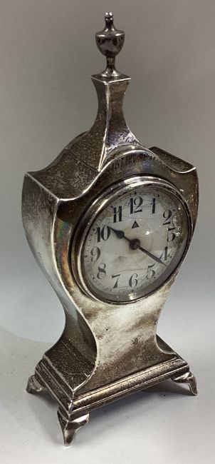 A large silver clock on feet. Birmingham 1921. By ES Barnsley & Co. Approx. 499 grams of gross weight. Est. £200 - £300.