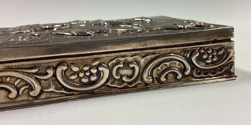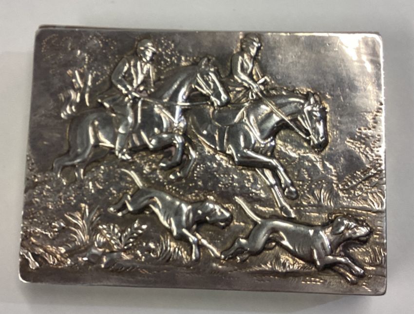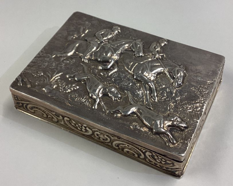 OF HUNTING INTERST: A silver snuff box embossed with huntsmen and hounds bearing import marks. Approx. 143 grams. Est. £150 - £200.