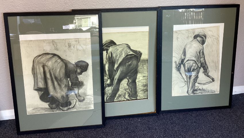 A trio of framed and glazed (one missing glass) charcoal and chalk drawings depicting farmhands. Apparently unsigned. Approx. 38 cm x 47 cm (ss). Est. £20 - £30.