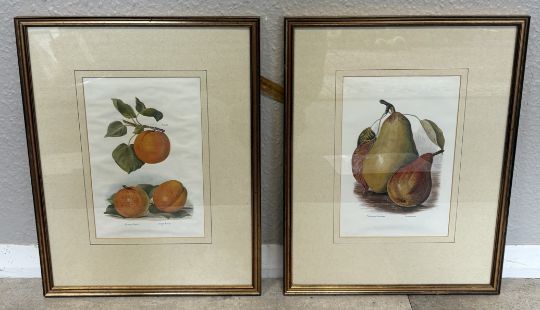 A pair of framed and glazed book prints depicting peaches and pears. Approx. 17 cm x 26 cm (ss). Est. £20 - £30.