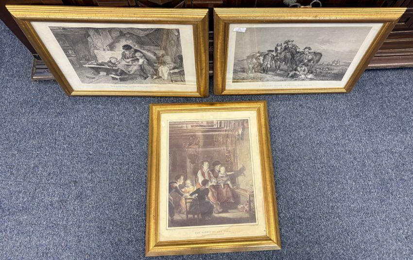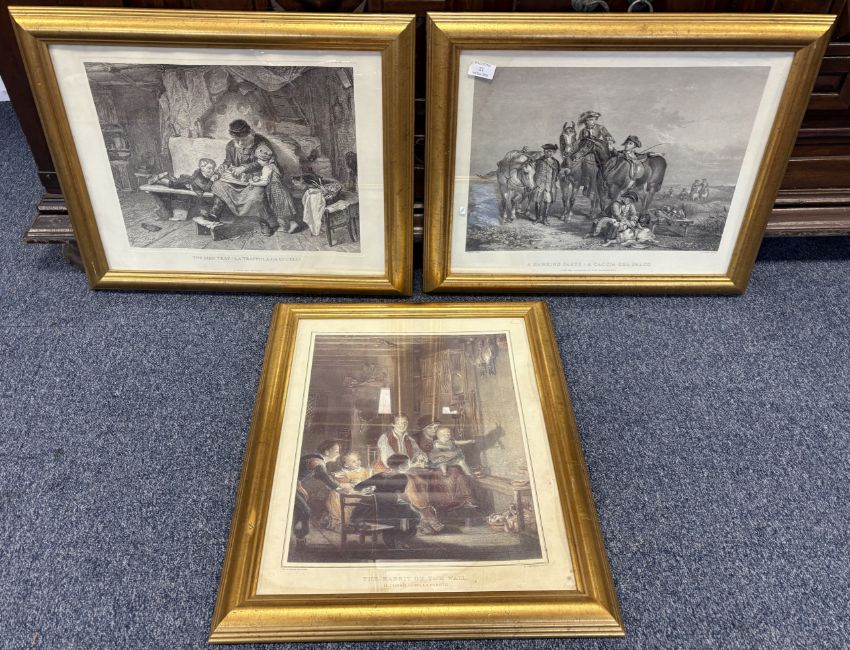 A trio of gilt framed and glazed prints. Approx. 49 cm x 38 cm (ss). £20 - £30.