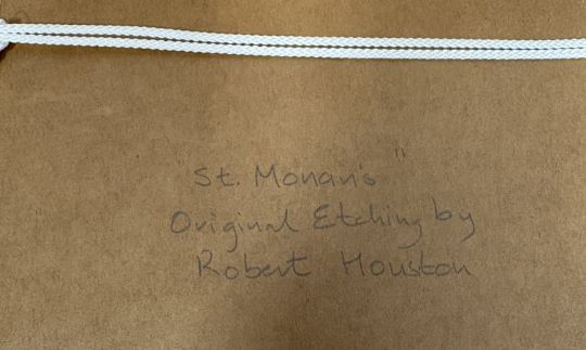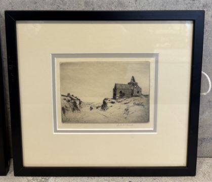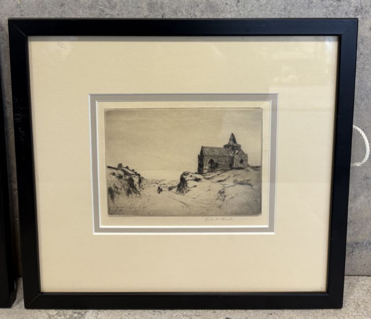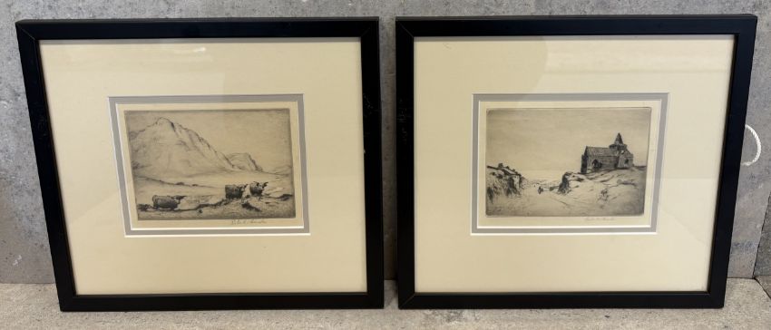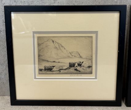 ROBERT HOUSTON: (Scottish, 1891 - 1942): Two framed and glazed etchings depicting St Monans and Highland cows. Pencil signed to bottom right. Approx. 15 cm x 10 cm (ss) each. Est. £20 - £30.