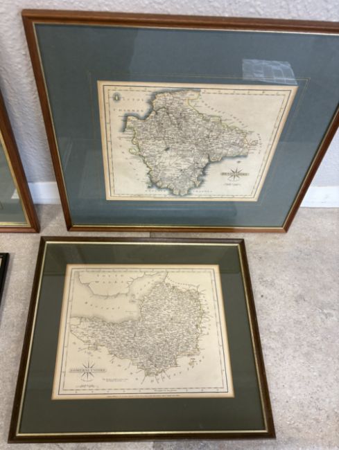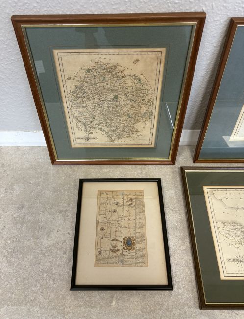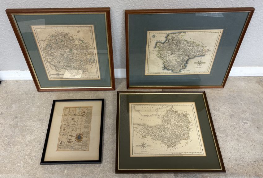 Three framed and glazed antique maps depicting Devonshire, Somersetshire and Herefordshire. Various sizes. Together with a smaller framed and glazed print. Est. £20 - £30.